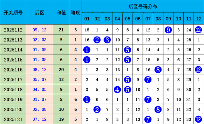 一区(1-12):上期开出奖号3个,近十期出号较热,近5期出现0次断区,本期推选该区奖号1枚06。